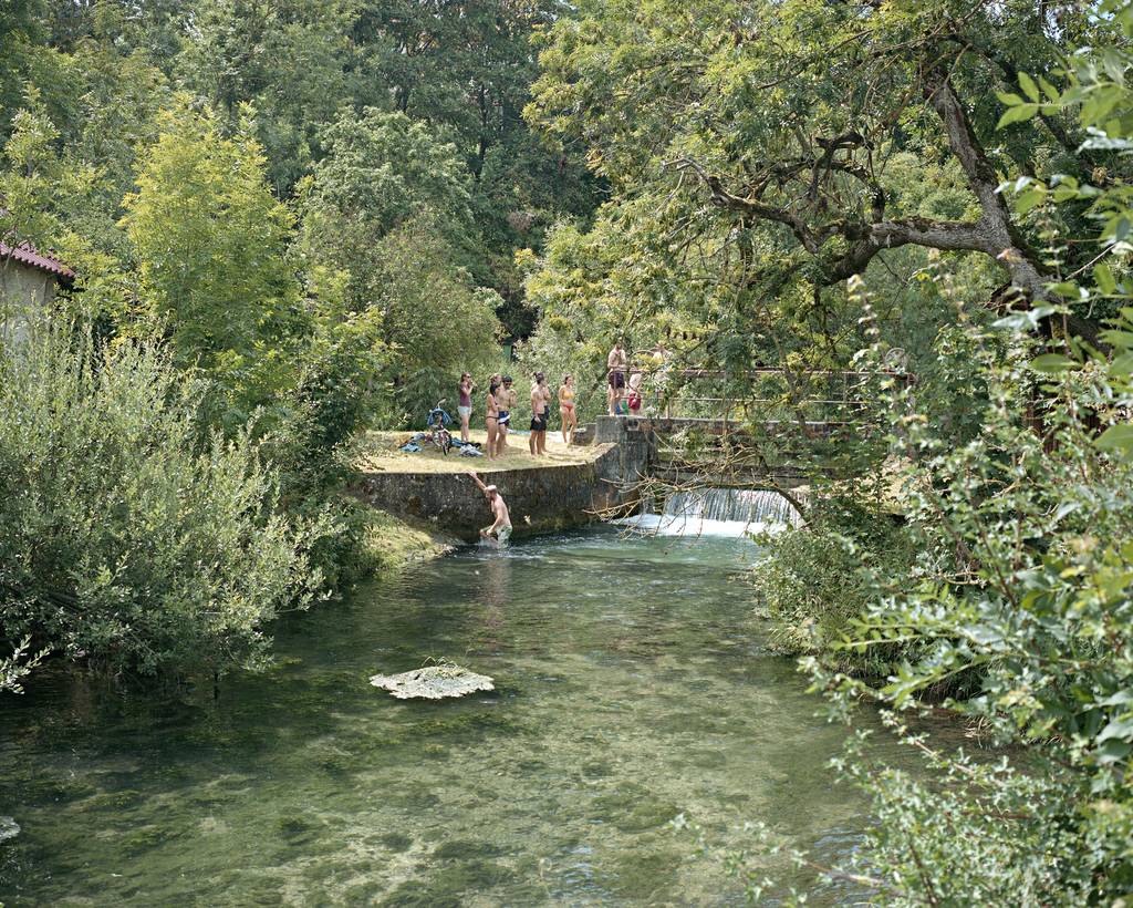 Am anderen Ende des Dorfes hat der Müller den Gästen erlaubt, das Wehr zu nutzen, um sich im kalten Bach abzukühlen.