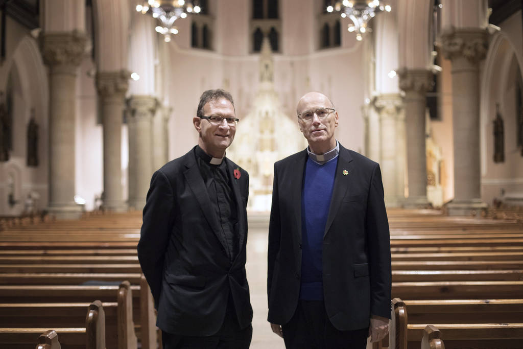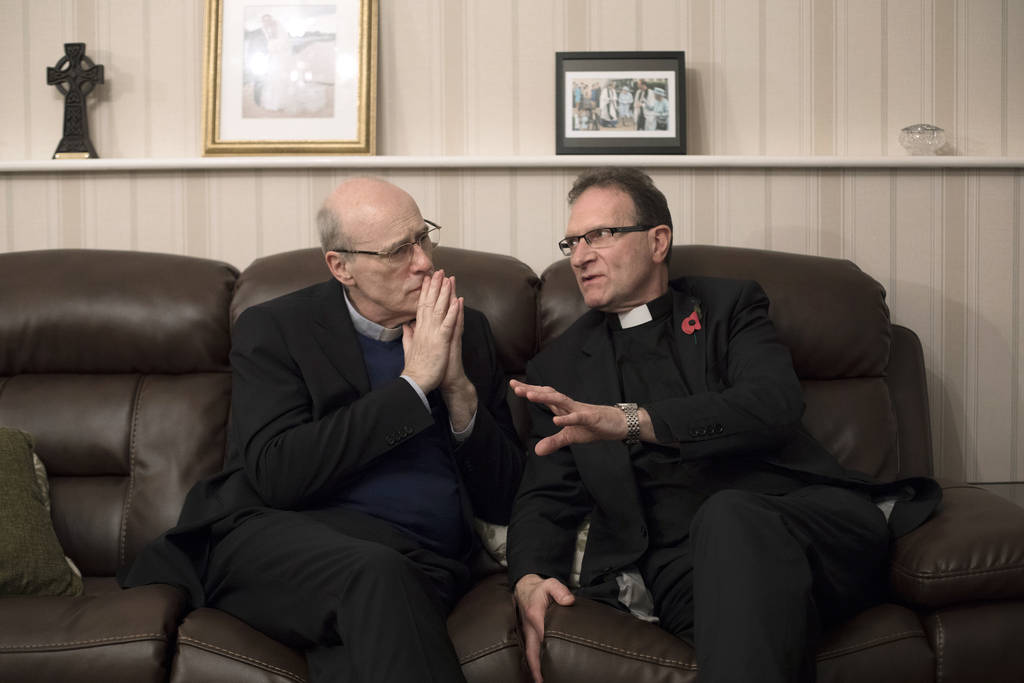 Reverend Kenneth Hall (links) und sein katholischer Kollege Monsignore Peter O'Reilly in der katholischen Sankt-Michael-Kirche in Enniskillen. Beide fingen etwa zur gleichen Zeit im September 2010 in ihrer Gemeinde an. Bald freundeten sie sich an und treten seitdem häufig gemeinsam auf, um eine Brücke zwischen Protestanten und Katholiken zu schlagen.