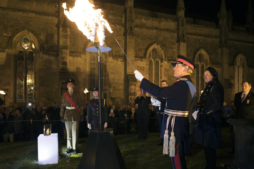 Viscount Brookeborough zündest zum Gedenken an die Gefallenen der Weltkriege eine Fackel an.